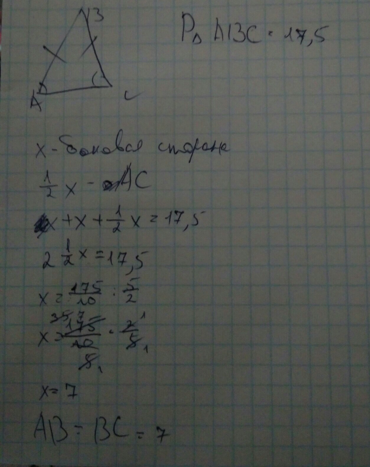 Пж помогите,срочно нужна помощь.....Периметр равнобедренного треугольника равен 17,5.Найдите стороны этого треугольника,если основание составляет 1/2 боковой стороны