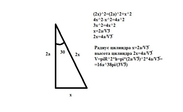 ПОМОГИТЕ ПОЖАЛУЙСТА! Завтра сдавать!! В цилиндр вписана призма. Основанием призмы служит прямоугольный треугольник, катет которого равен 2a, а прилежащий угол равен 30°. Диагональ большей боковой грани призмы составляет с плоскостью её основания угол в 45°. Найдите объем цилиндра.