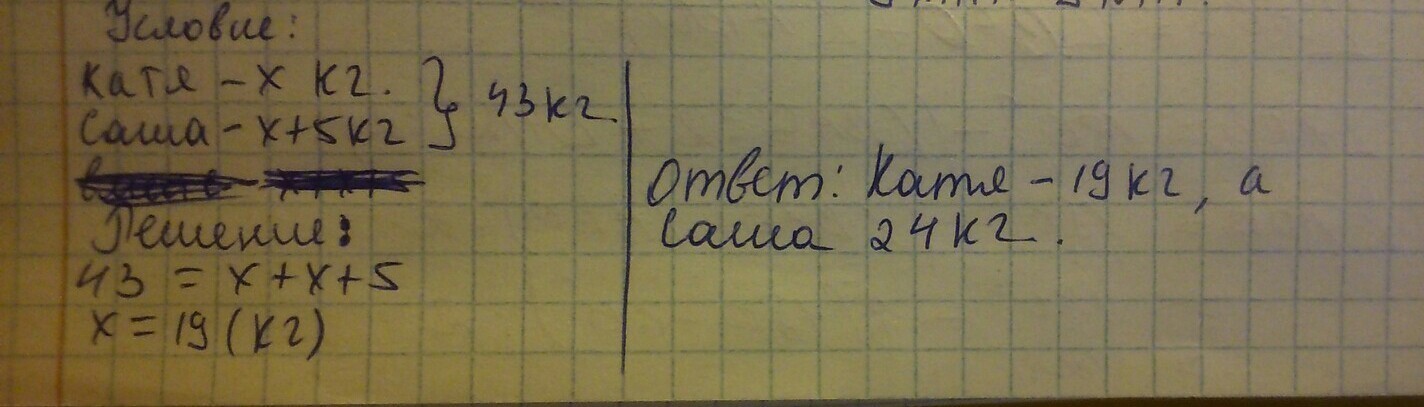 ОТВЕТ: Катя собрала 19 кг картофеля, а Саша 24 кг.