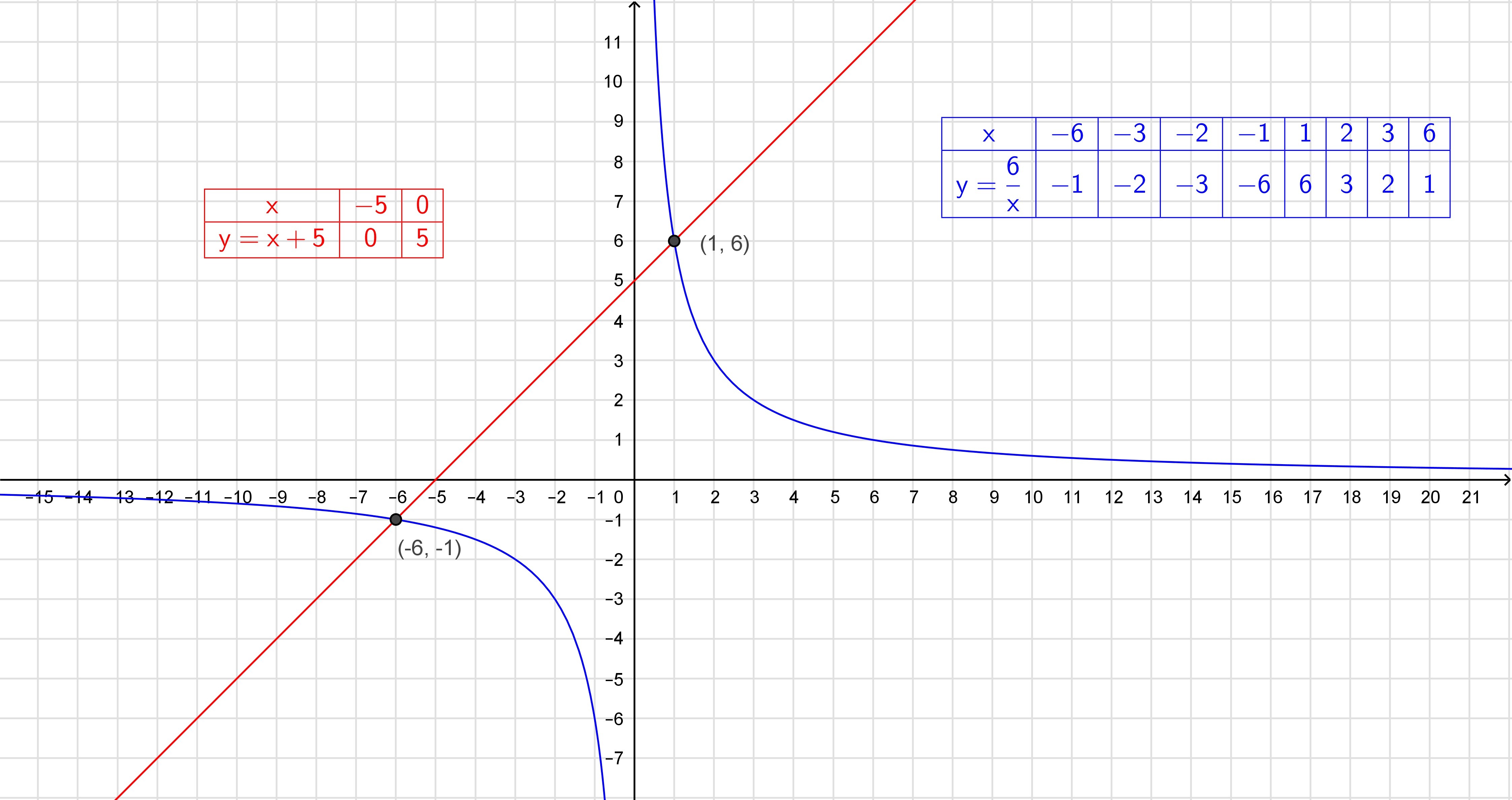 Постройте график в одной системе координат графики функций y=6/x и y=x+5 . Определите координаты трчек пересечения.
