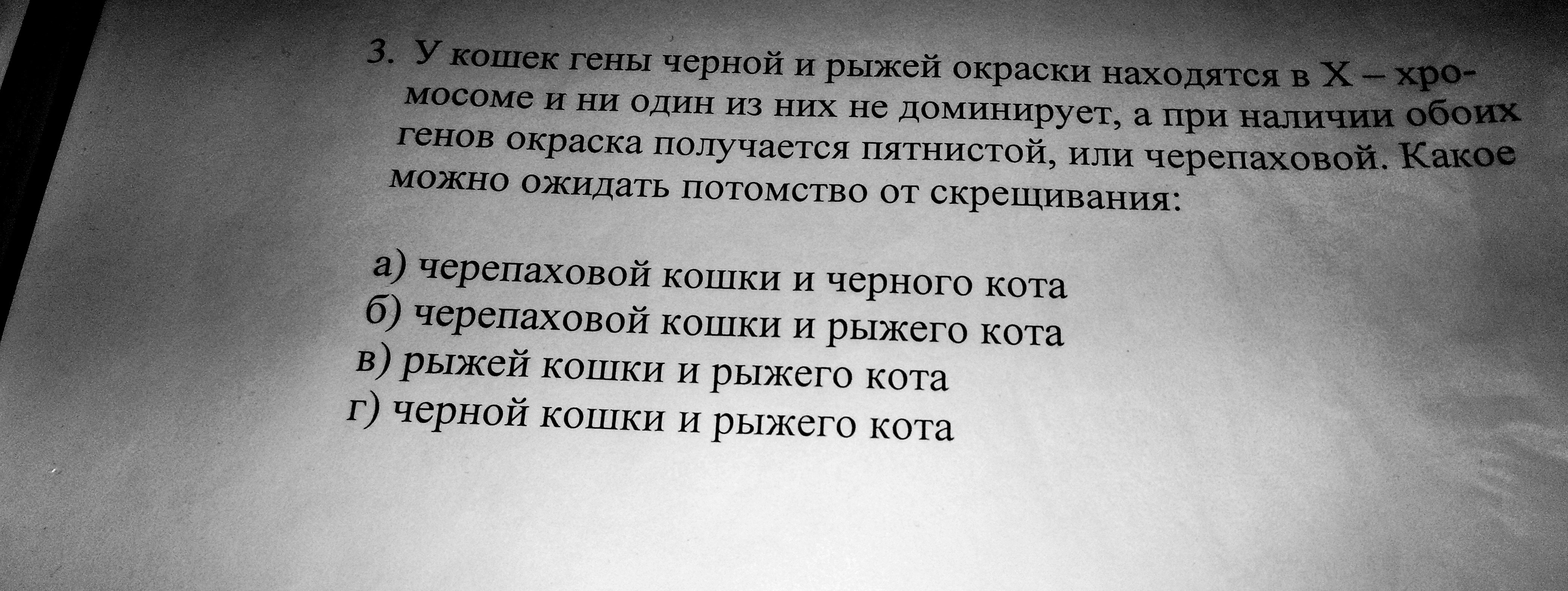 Черная кошка, рыжий кот. Р: ХВХВ Х ХвУ. G: у кошки ХВ, в котаХв и У.F1:ХВ Хв черепах кошка, ХВУ черн кот