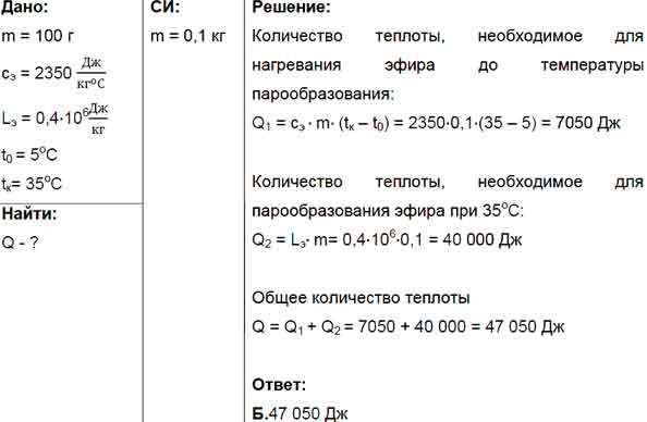 Найди, какое количество теплоты нужно для обращения в пар эфира массой 100 г, взятого(-ой) при температуре 12 °С. (Удельная теплоёмкость эфира с=2300 Дж/кг·°С, температура кипения эфира равна 35 ° С, удельная теплота парообразования эфира L=352000 Дж/кг). Ответ (округли до целого числа): кДж.