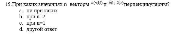 Если векторы a(a1,a2,a3) и b(b1,b2,b3) перпендикулярны, то их скалярное произведение a*b=0. Так как a*b=a1*b1+a2*b2+a3*b3, то, подставляя в это выражение данные из условия, получаем уравнение n*1+1*(-2)+1*n=2*n-2=0, откуда n=1. Ответ: при n=1.