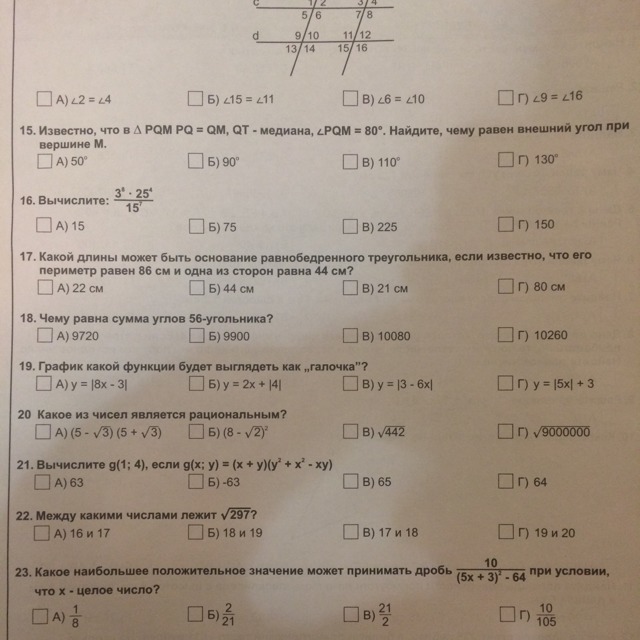 №17 Решение: P = 86, а одна сторона равна 44, следовательно она самая большая. 86 - 44 = 42 и делим на 2 = 21.