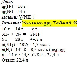 Химия на 4 декабря Задача. Какой объём аммиака образуется при взаимодействии 10 гр водорода с 14 гр азота?