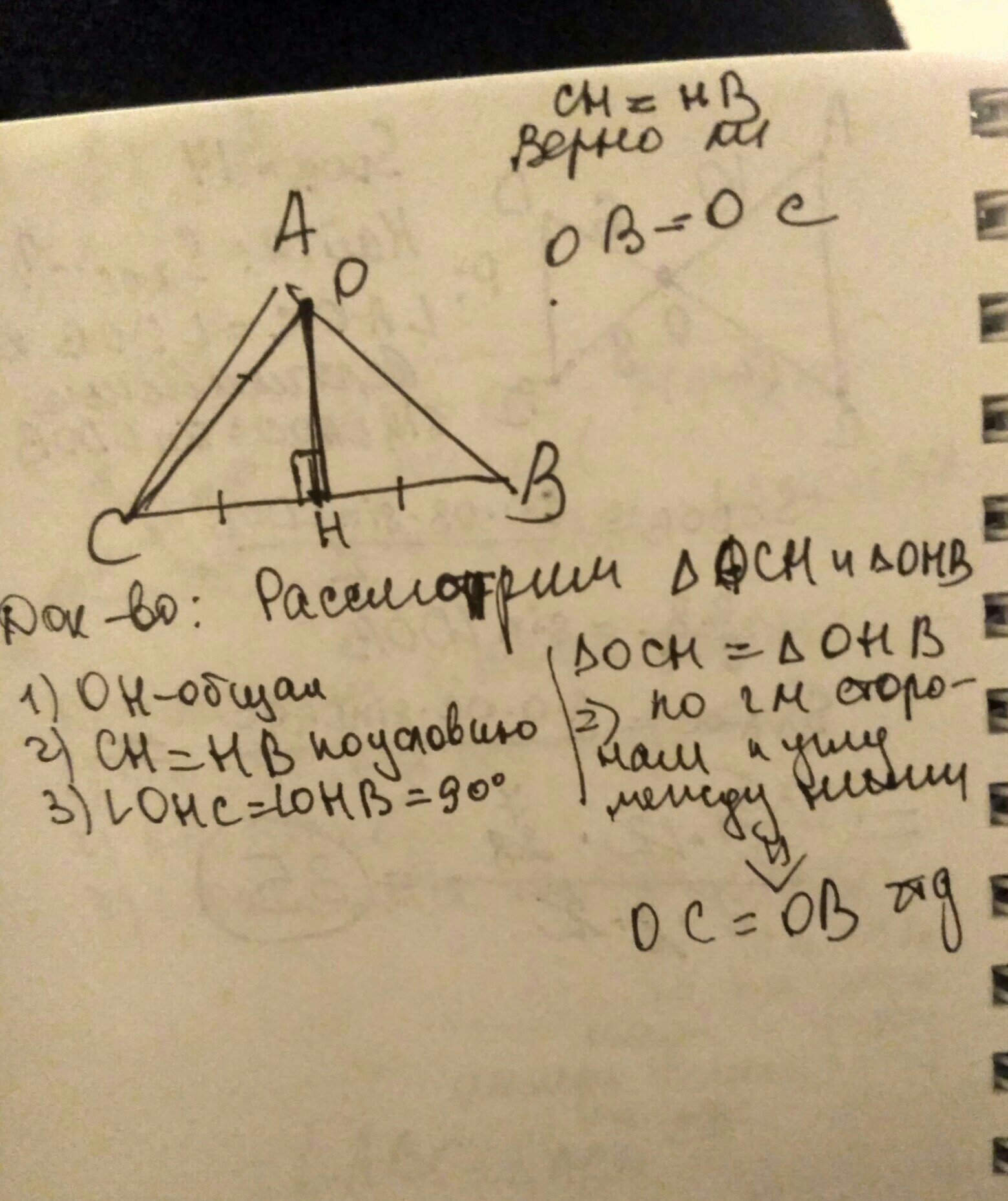 серединный перпендикуляр к стороне bc треугольника abc пересекает сторону AB в точке O.Верно ли, что отрезки OB и OC равны?