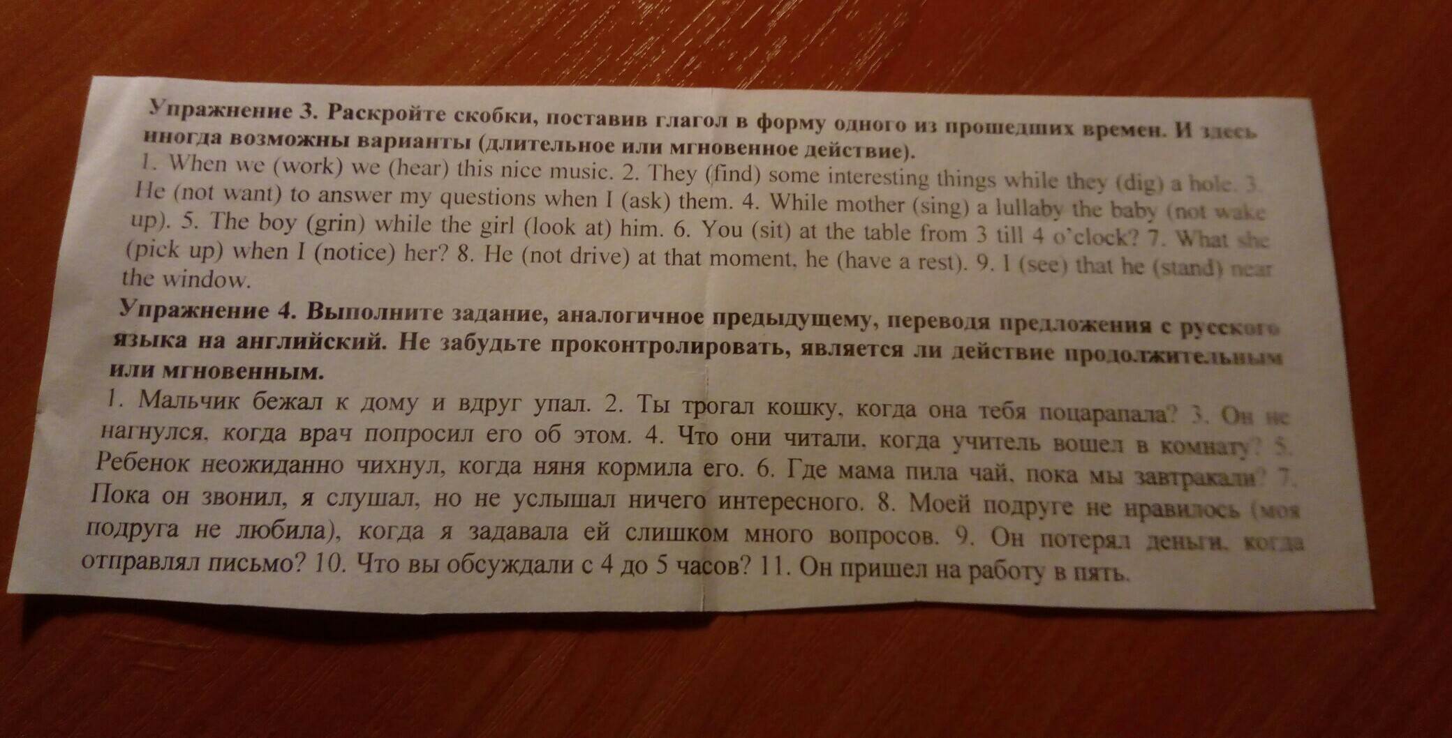 When we were working we heard this nice music.They found scratchedyousome interesting things while they were digging a hole.He didn’t want to answer my questions when I was asking him.While mother was singing a lullaby the baby didn’t wake up.The boy grinned while the girl was looking at him.You have sitten at the table from 3 till 4 o’clock?What did she pick up when I was noticing her?He didn’t drive at that moment, he was having a rest.I saw that he was standing near the window