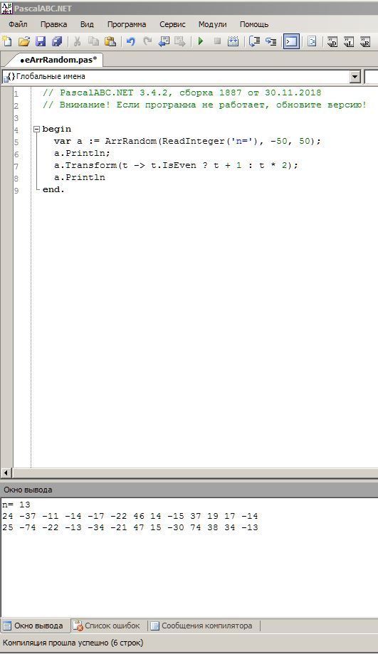 Дан линейный массив A[1..N], содержащий целые числа. Преобразовать элементы массива по следующему правилу: если элемент четный, прибавить к нему 1, если нечетный – умножить на два.