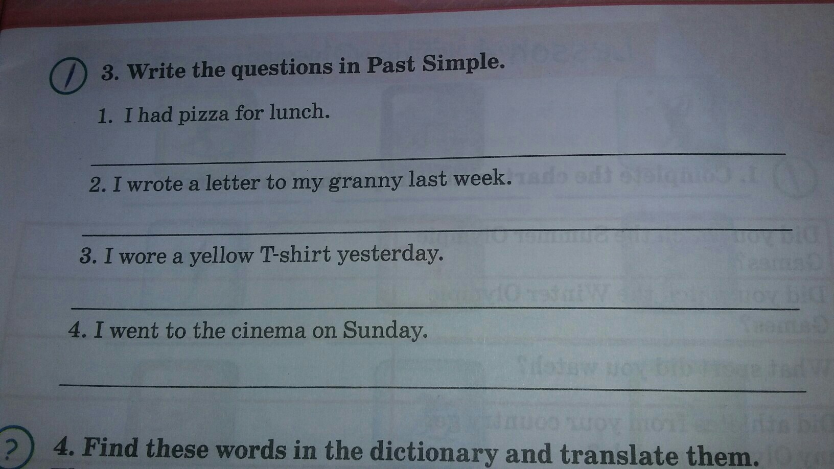 ) 3. Напишите вопросы в Прошлом Простом. 1. У меня была пицца на обед. 2. На прошлой неделе я написал письмо моей бабушке. 3. Вчера я носил желтую майку. 4. Я пошел в кино в воскресенье.