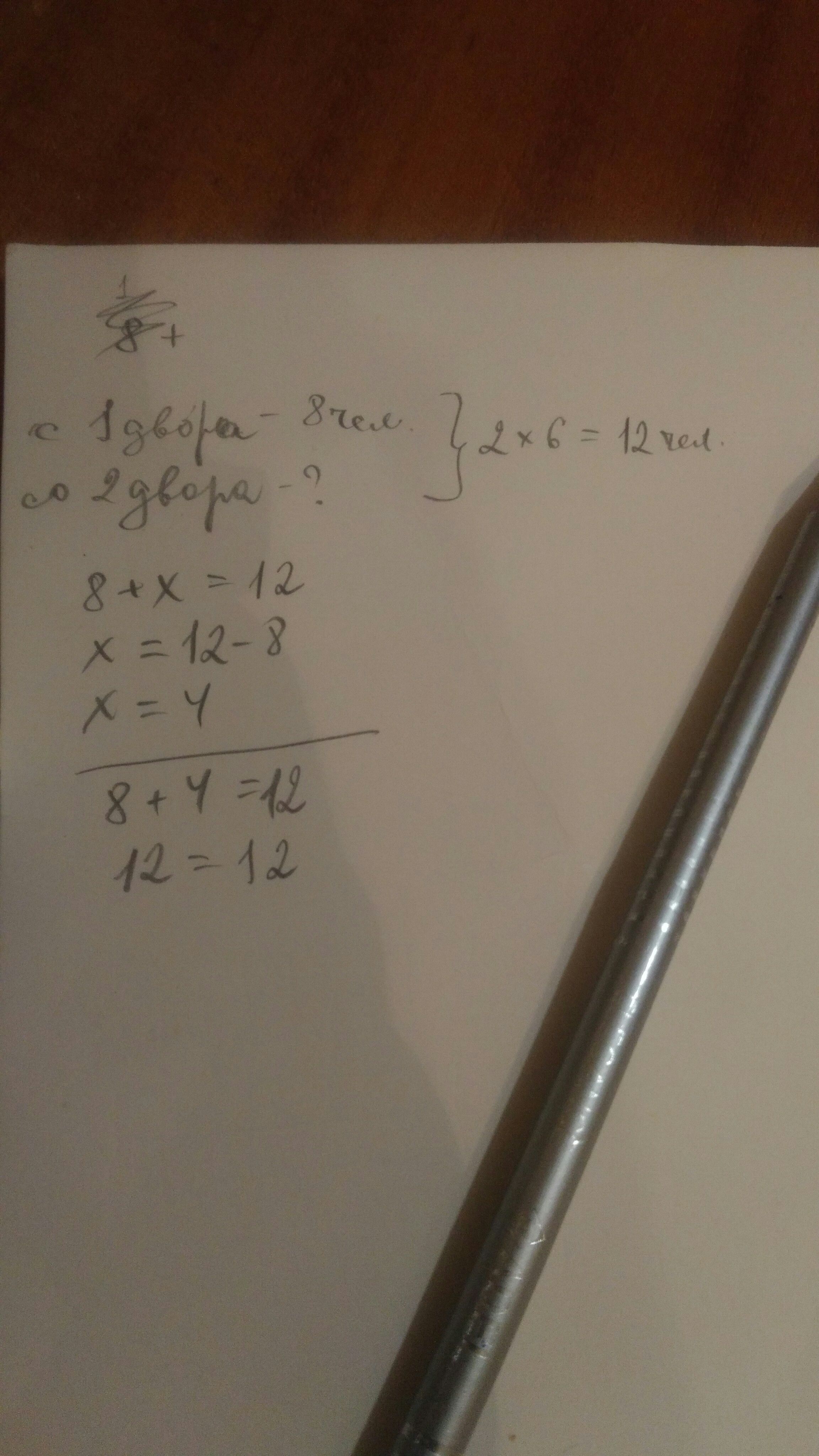 Всего 12 чел, с 1 двора - 8 чел, а с другого - Х. Составляем уравнение: 8+Х=12 , Х=4. Всё правильно.