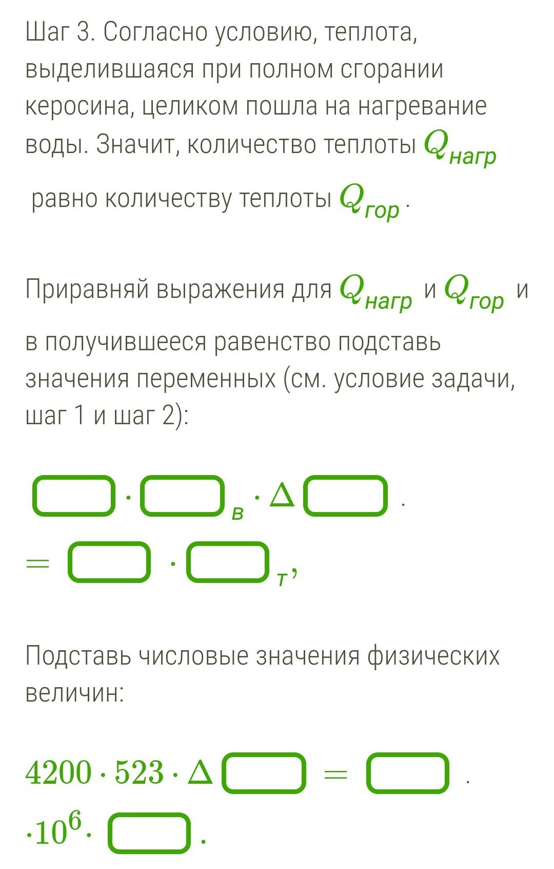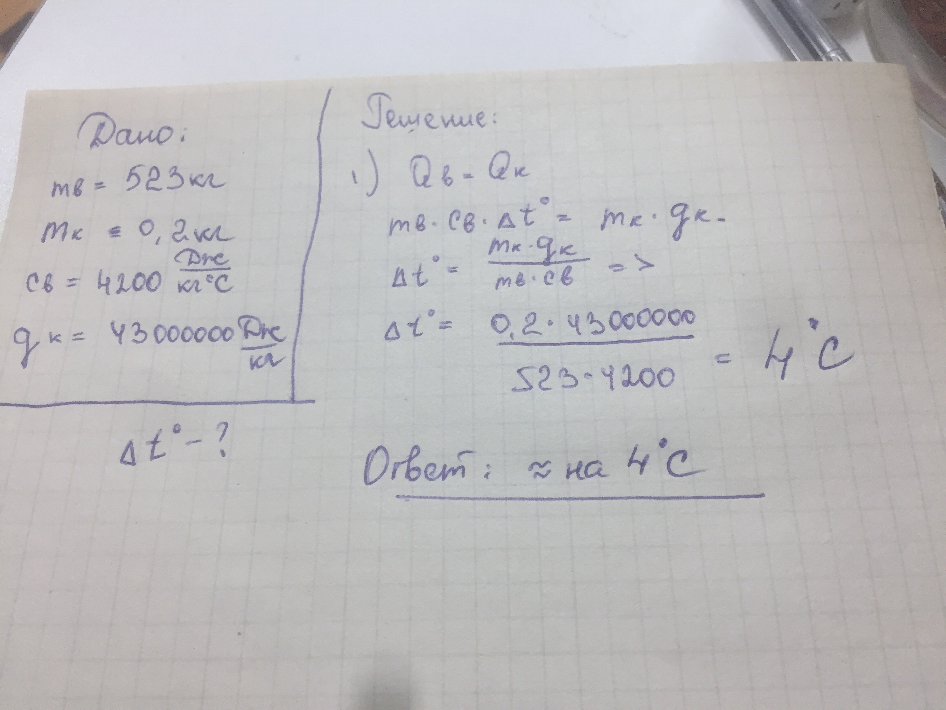Определи, на сколько градусов можно нагреть воду массой 523 кг при сжигании керосина массой 0,2 кг, если считать, что теплота, выделившаяся при полном сгорании керосина, целиком пошла на нагревание воды. Удельная теплоёмкость воды равна 4200 Дж/(кг·°С), удельная теплота сгорания керосина — 43 МДж/кг.