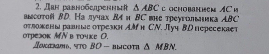 Рассмотрим треугольники МВО и треуг. ВОN так треуг. АВС равноб.по условию ,то АВ=ВN ,АМ=CN по условию тогда МВ=ВN те они образованы сложением равных отрезков.ВD является высотой в рпвн треуг.АВС след из свойства равн.треуг она является и биссектрисой тогда угол В разделен BD на равные углы 1 и 2 ВО общая сторона рассматриваемых трег.тогда треуг.АВО= треуг.ВNO по 1 признаку (Двух сторонам и углу между ними. След треуг.МВN равнобедренный те МВ=ВN ,MO=ON ,след луч ВD будет является высотой в Треуг МBN.