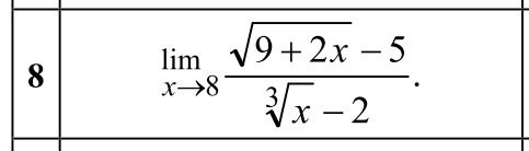 displaystyle lim_{x to 8} frac{sqrt{9+2x}-5}{sqrt[3]{x}-2}=|*frac{(sqrt[3]{x^2}+2sqrt[3]{x}+4)(sqrt{9+2x}+5)}{(sqrt[3]{x^2}+2sqrt[3]{x}+4)(sqrt{9+2x}+5)}|=\\ lim_{x to 8} frac{((sqrt{9+2x})^2-25)*(sqrt[3]{x^2}+2sqrt[3]{x}+4)}{(sqrt[3]{x^3}-8)(sqrt{9+2x}+5)}=\\= lim_{x to 8}frac{(2x-16)(sqrt[3]{x^2}+2sqrt[3]{x}+4)}{(x-8)(sqrt{9+2x}+5)}=\\= lim_{x to 8} frac{2(sqrt[3]{x^2}+2sqrt[3]{x}+4)}{sqrt{9+2x}+5}=frac{2(sqrt[3]{8^2}+2sqrt[3]{8}+4)}{(sqrt{9+2*8}+5)}=