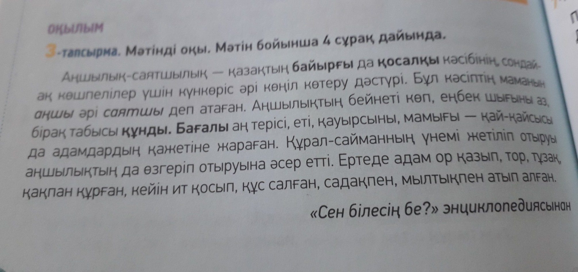 Охота и экскурсия - традиция казахского языка и традиции, а также традиция выживания и процветания для кочевников. Охотник, которого называют охотником и охотником, имеет изображение охотника, затраты на рабочую силу низки, но его доход ценен. Драгоценный мех, бородатый живот дальше нез