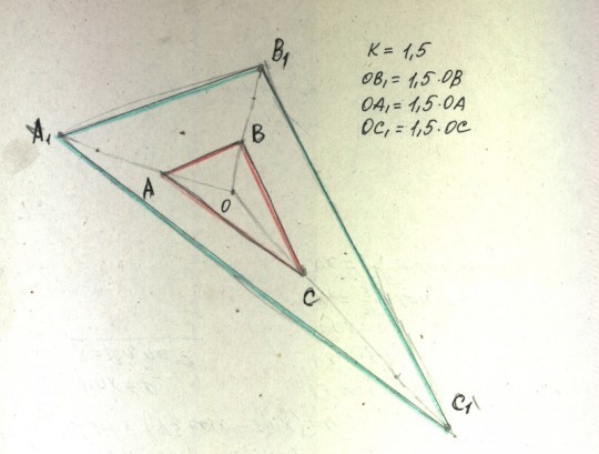 Даны точка O и треугольник ABC. Взяв точку O за центр и за коэффициент гомотетии k=1,5 постройте треугольник, гомотетичный данному. Ответ можно пожалуйста понятный.
