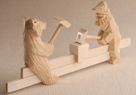 эту игрушку делали их отходов дерева ее не раскрашивали зато она была подвижной : кони передвигали ного, мужик и седведь пилили бревно и т.д.