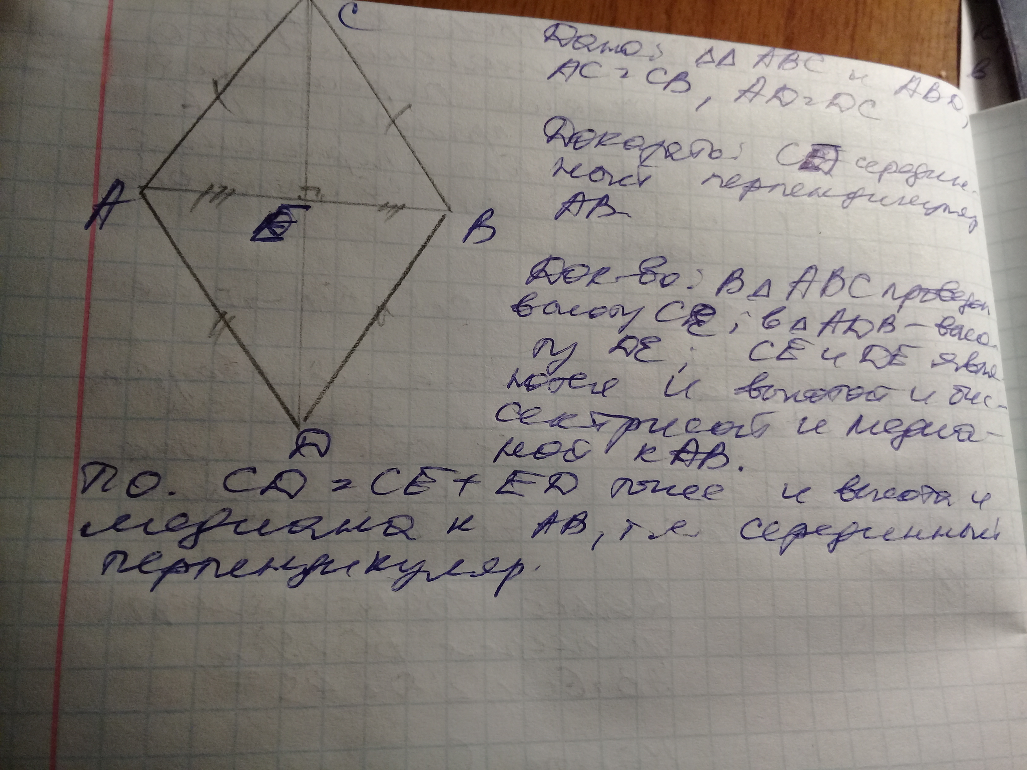 Равнобедренные треугольники ABC и ABD имеют общее основание AB. Докажите, что прямая CD-серединный перпендикуляр стороны AB.