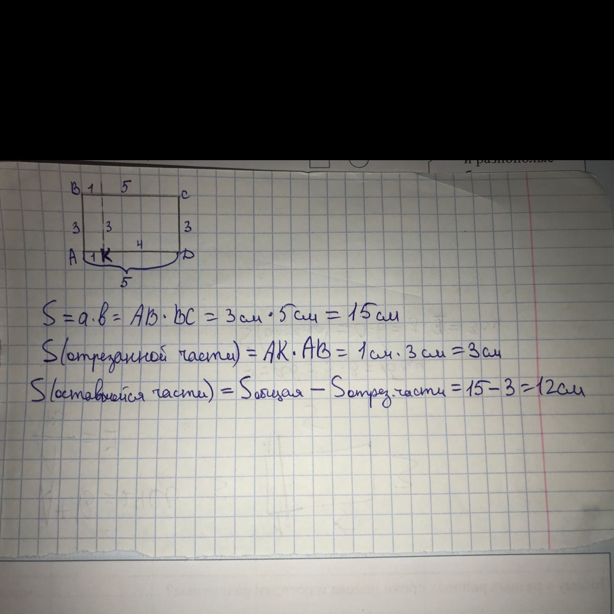 От прямоугольника ,длины сторон которого 5см и 3 см ,отрезали полоску со сторонами 3 см и 1 см .Найди плошадь оставшейся части