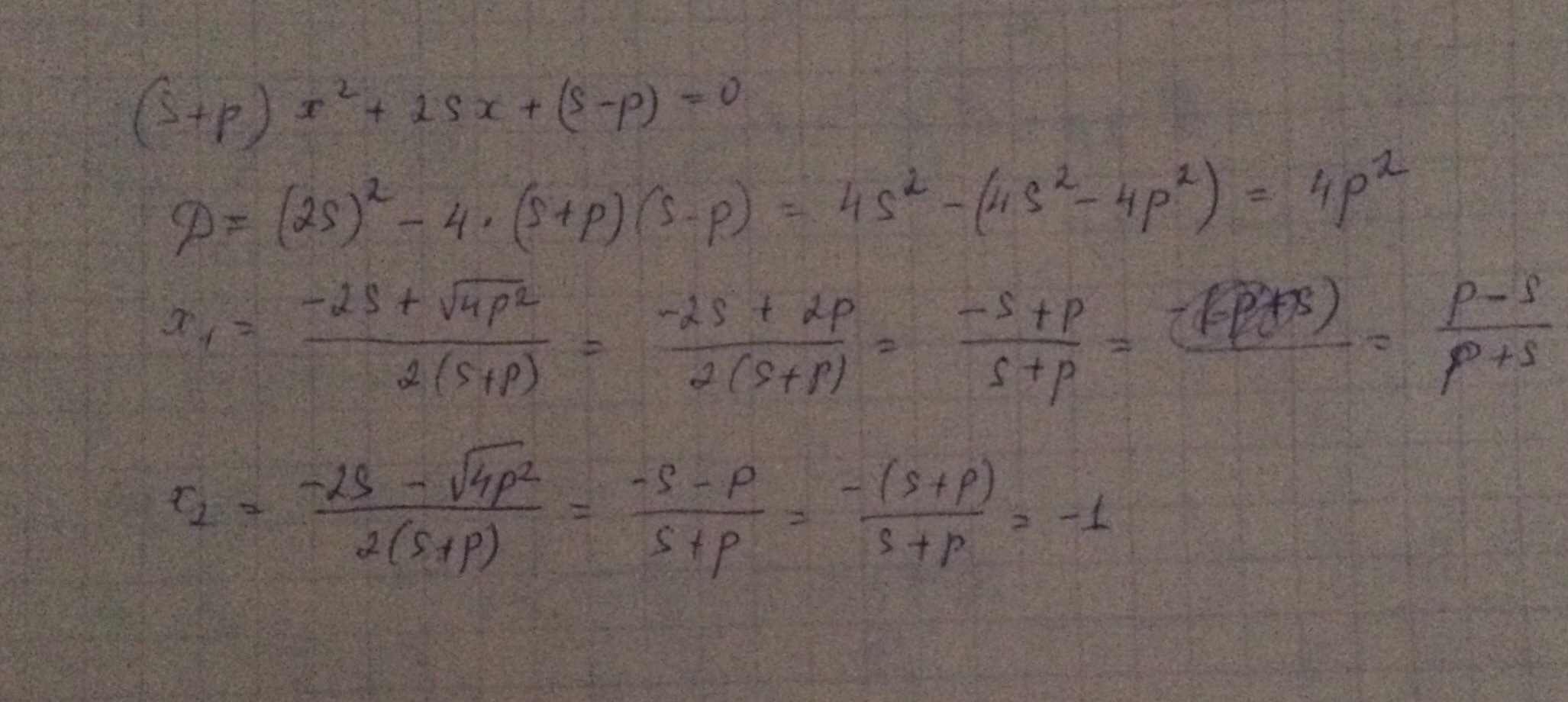 Решаем как обычное квадратное уравнение, где а=s+p, b=2s, c=s-p.