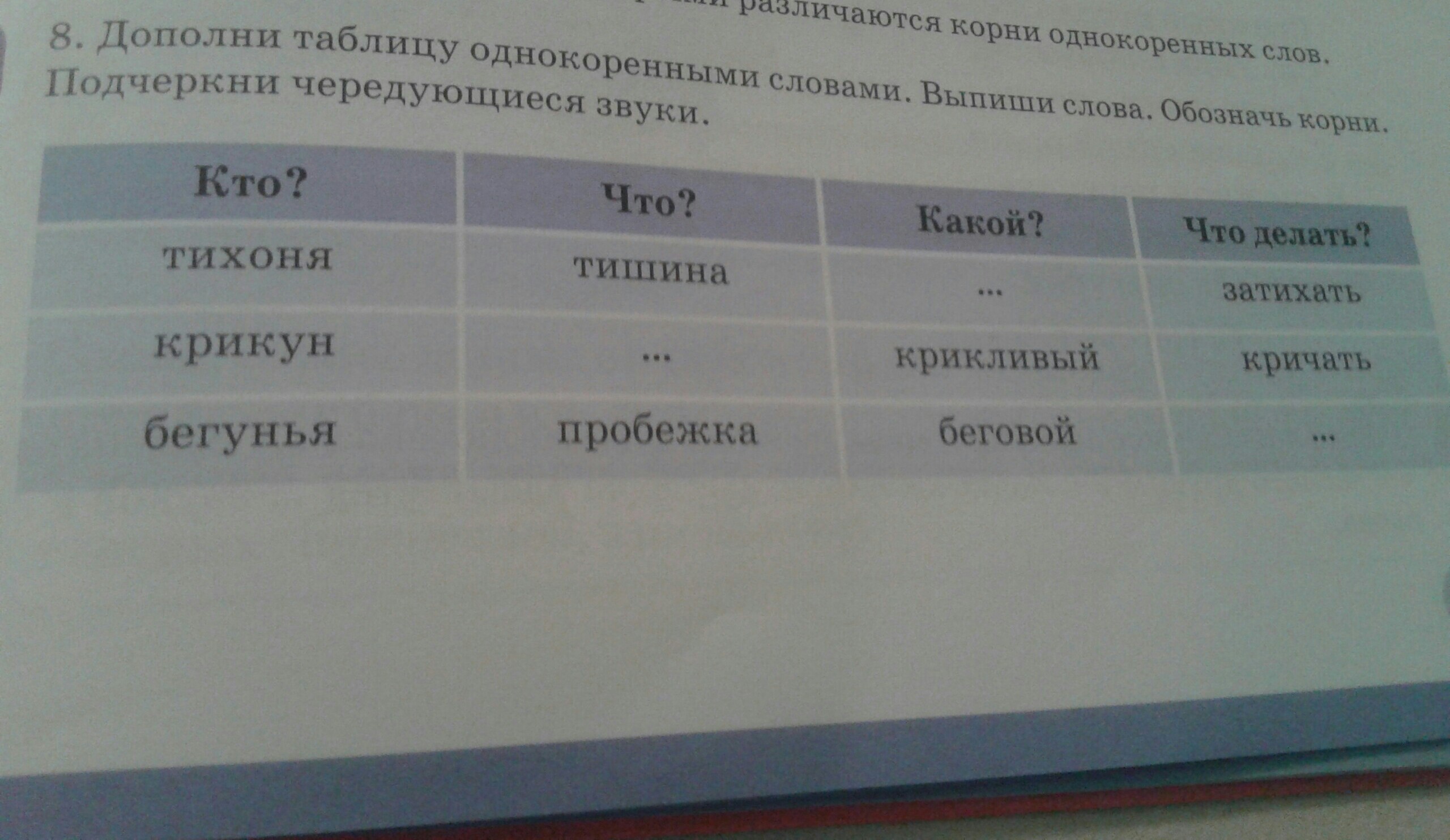 Дополни таблицу однокоренными словами.Выпиши слова.Обозначь корни.Подчеркни чередующиеся звуками.дам10баллов