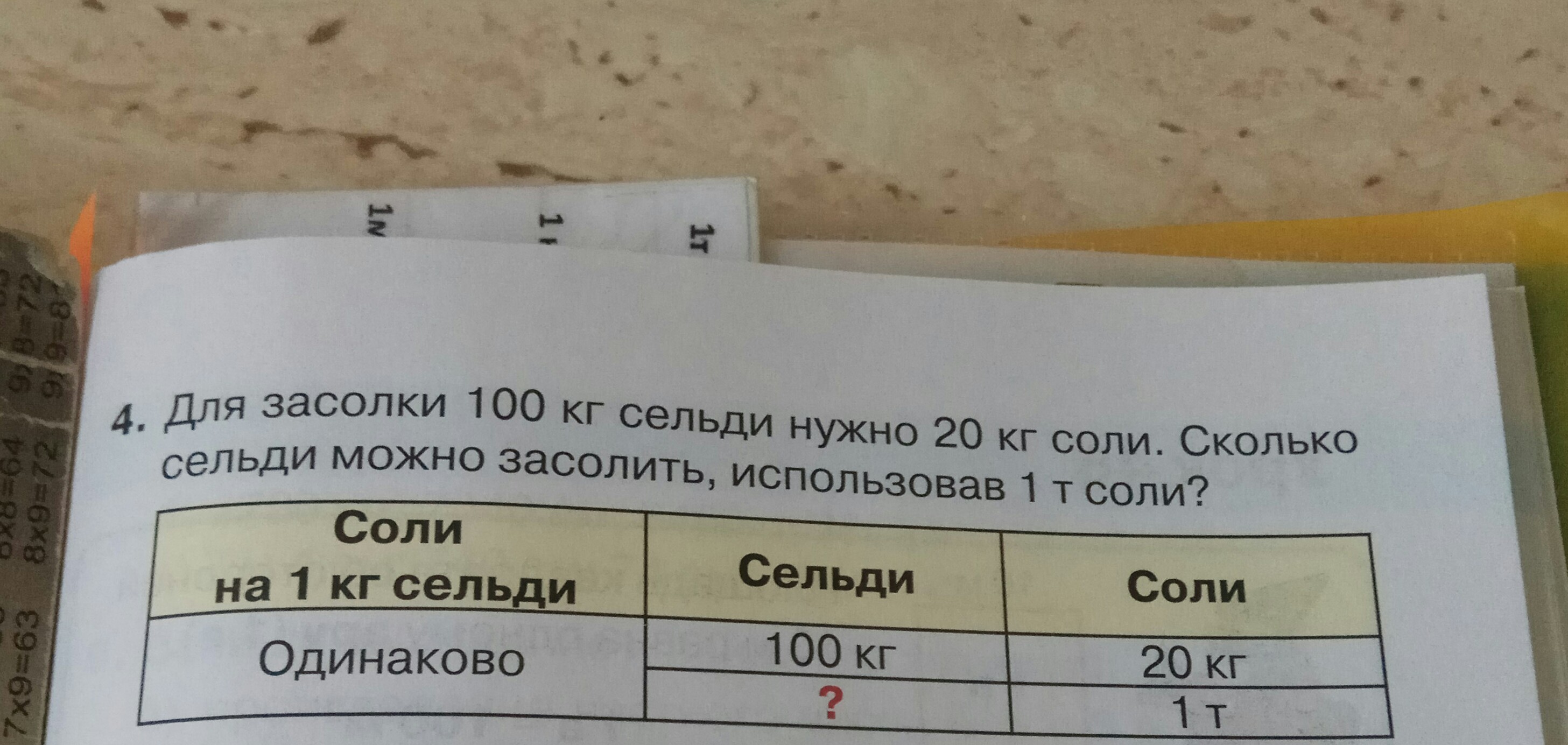 1) 100 кг : 20 кг = 5 кг сельди на 1 кг соли