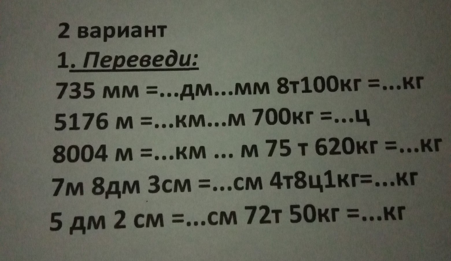 переведи 735мм=...дм...мм 8т100кг=...кг 5176м=...км...м 700кг=...ц 8004м=...км...м75т 620кг=...кг. 7м8дм 3см=...см 4т8ц1кг=...кг. 5дм 2см=...см 72т 50кг=...кг. HELP SOS пожалуйста!