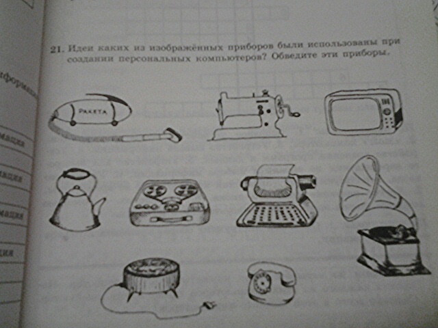 Телефон, печатная машинка, микроволновка, проигрыватель.