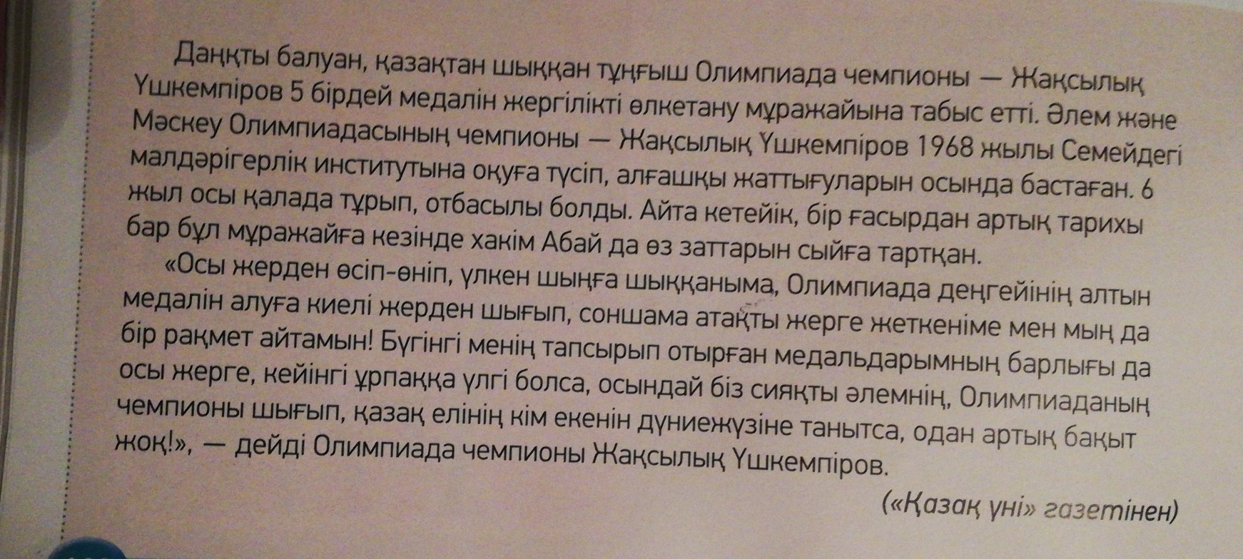 Прославленный борец, первый Олимпийский чемпион - Жаксылык Ушкемпиров вручил 5 одинаковых медаль в Местный краеведческий музей. Мир и Чемпион московской Олимпиады Жаксылык Ушкемпиров в 1968 году в Семее поступил в ветеринарный институт и начал первые тренировки здесь. Шесть год прожил в этом городе и был женат. Стоит отметить, что более века история в этом музее Хаким Абай также подарил свои вещи.