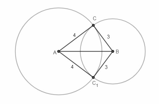 Для построения потребуется циркуль. Из точки А радиусом 4 см делаем засечки в предполагаемом месте пересечения. Из точки В радиусом 3 см - засечки до пересечения с окружностью.