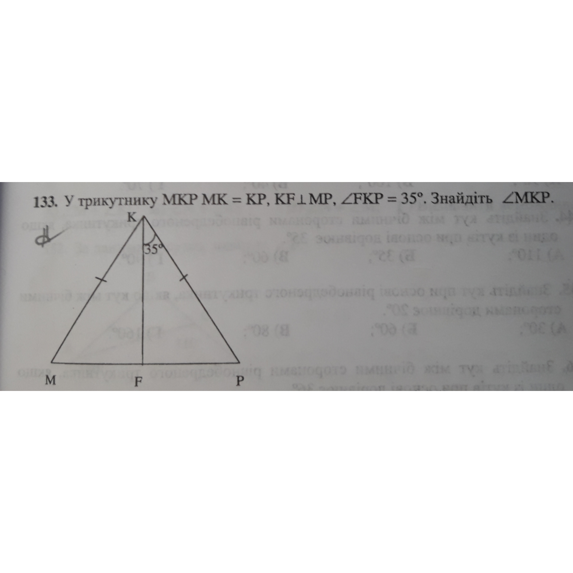 так как KF высота, имеем, что угол KFP=углу KFM=90°, следовательно, угол P=55° (угол М тоже равен 55°, так как треугольник МКР равнобедренный)