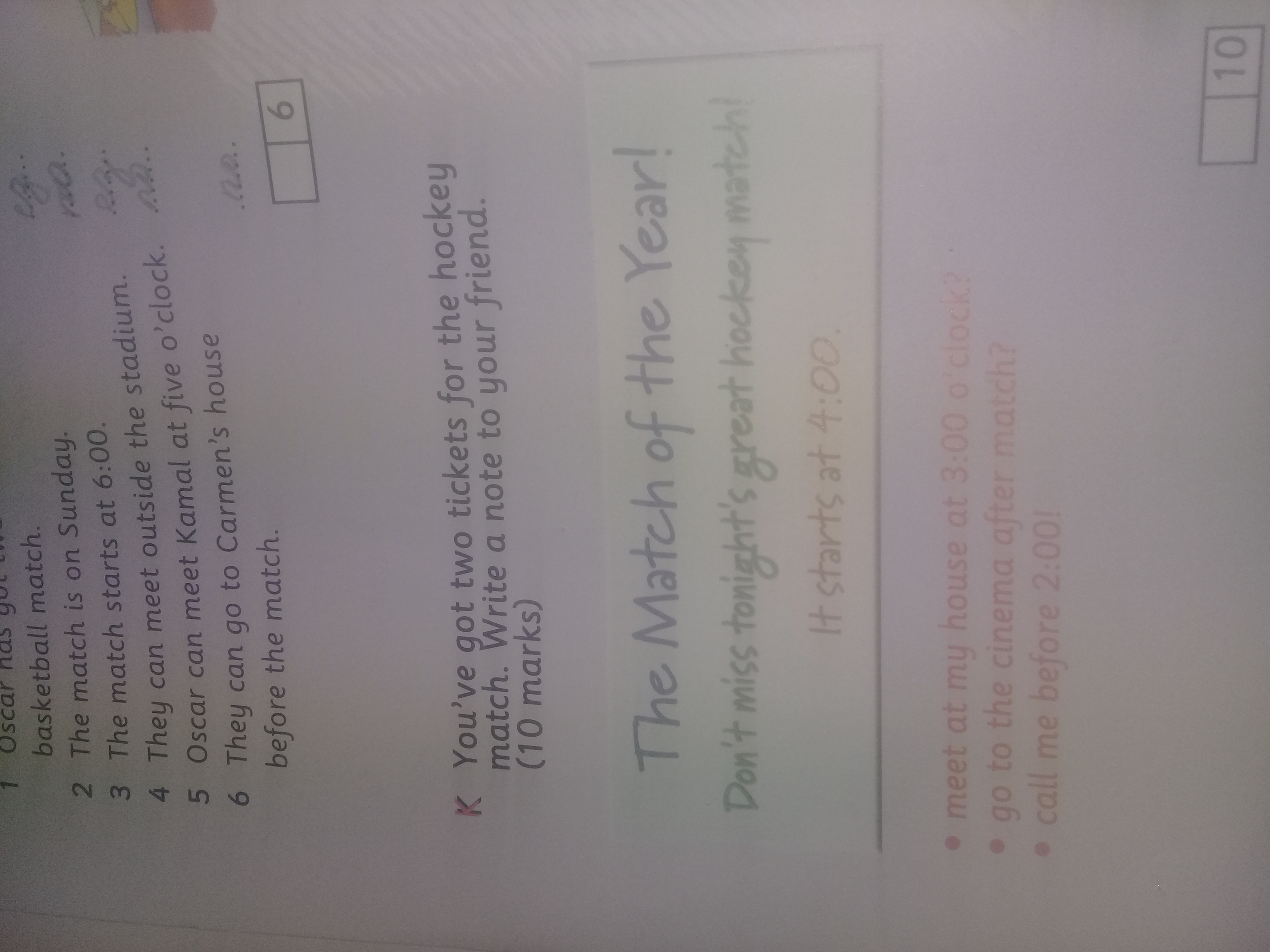 I have two tickets for the hockey match, it will be great if you come! Can we meet at my house at 3 o'clock? Just call me before 2:00.