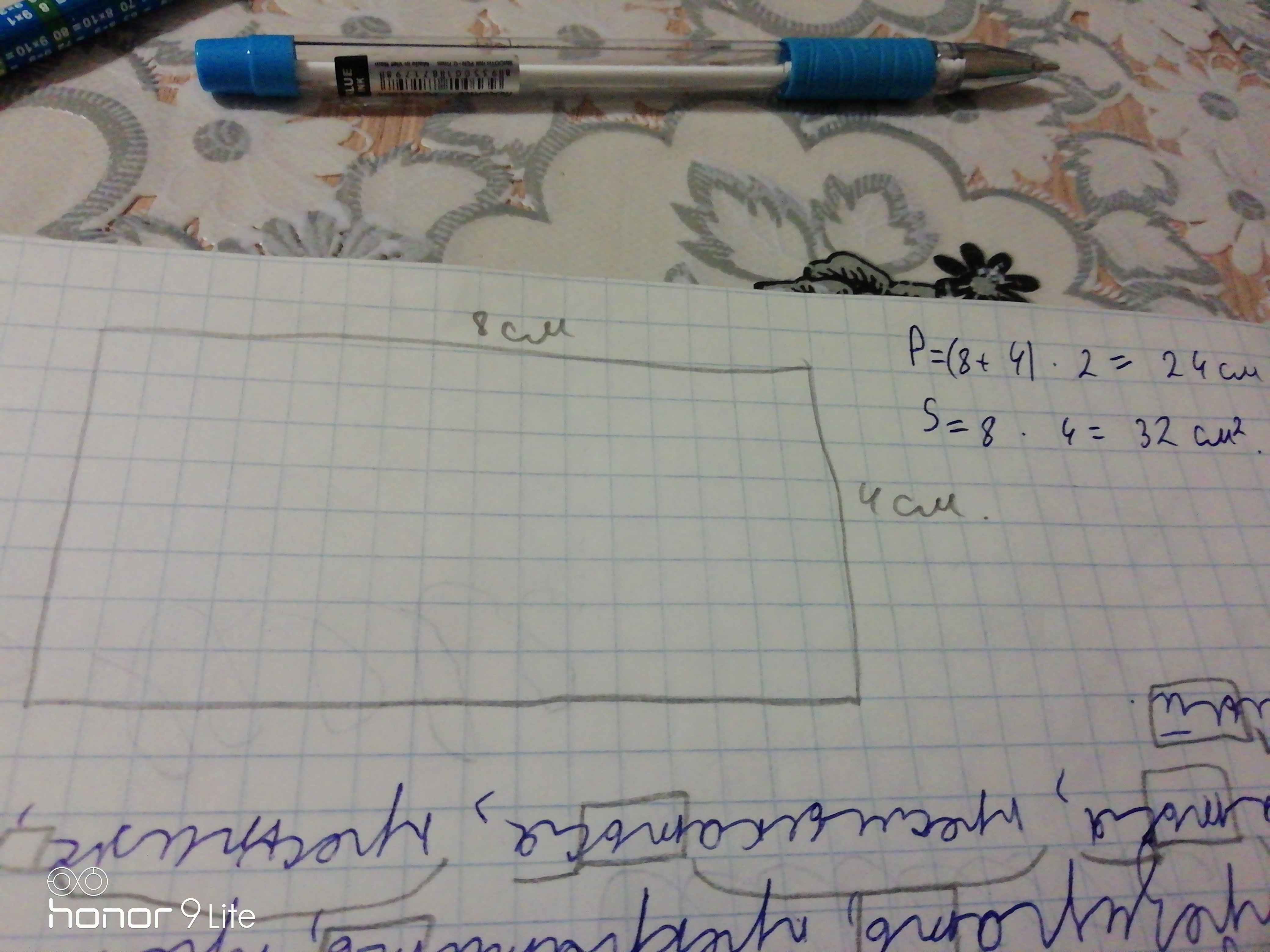 Начерть прямоугольник длина которого в 2 раза больше его ширины и составляет 8см .вычислить периметр и площадь данного прямоугольника.