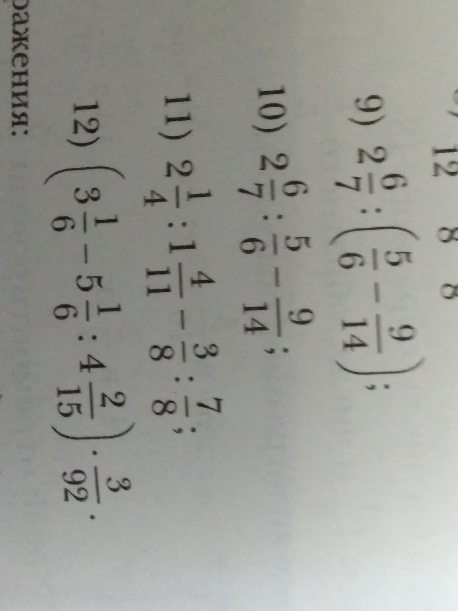 12.\\(3frac{1}{6}-5frac{1}{6}:4frac{2}{15})*frac{3}{92}=frac{1}{16}\\1)5frac{1}{6}:4frac{2}{15}=frac{31}{6}:frac{62}{15}=frac{31*15}{6*62}=frac{5}{4}\\2)3frac{1}{6}-frac{5}{4}=frac{19}{6}-frac{5}{4}=frac{19*2-5*3}{12}=frac{23}{12}\\3)frac{23}{12}*frac{3}{92}=frac{23*3}{12*92}=frac{1}{16}
