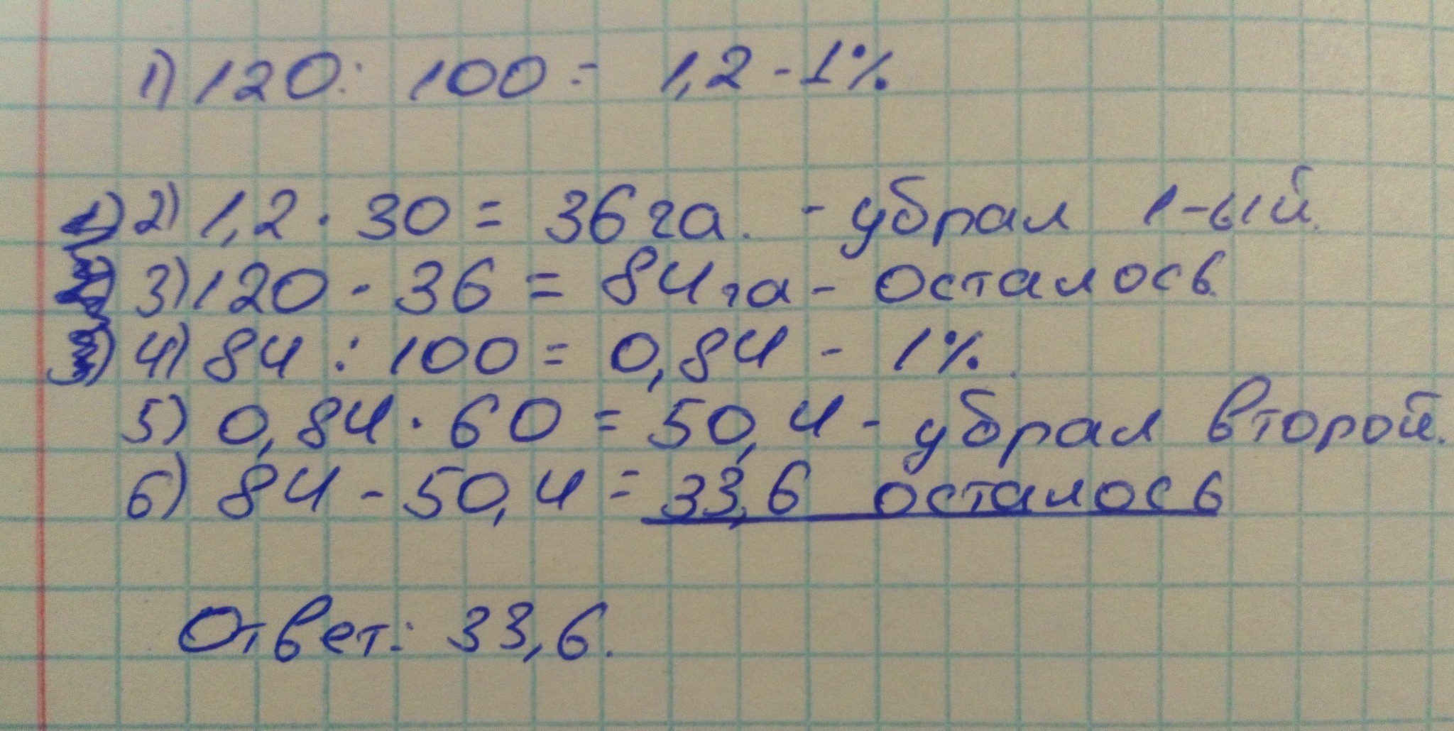 1)120·0,3=36(га)--убрал 1-ый комбайнер