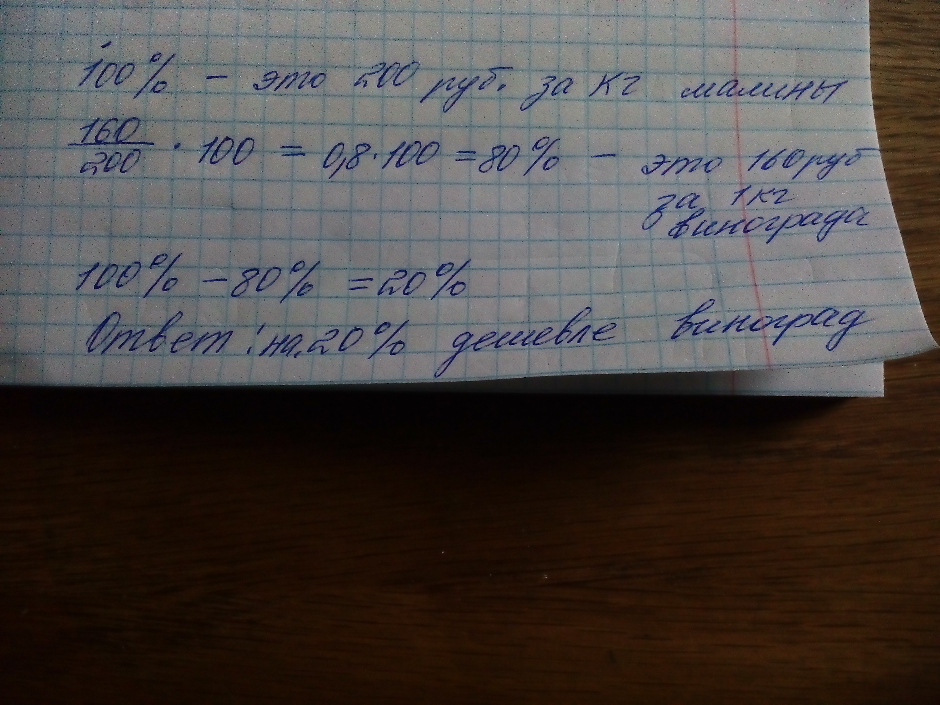Виноград стоит 160 рублей за килограмм, а малина — 200 рублей за килограмм. На сколько процентов виноград дешевле малины?