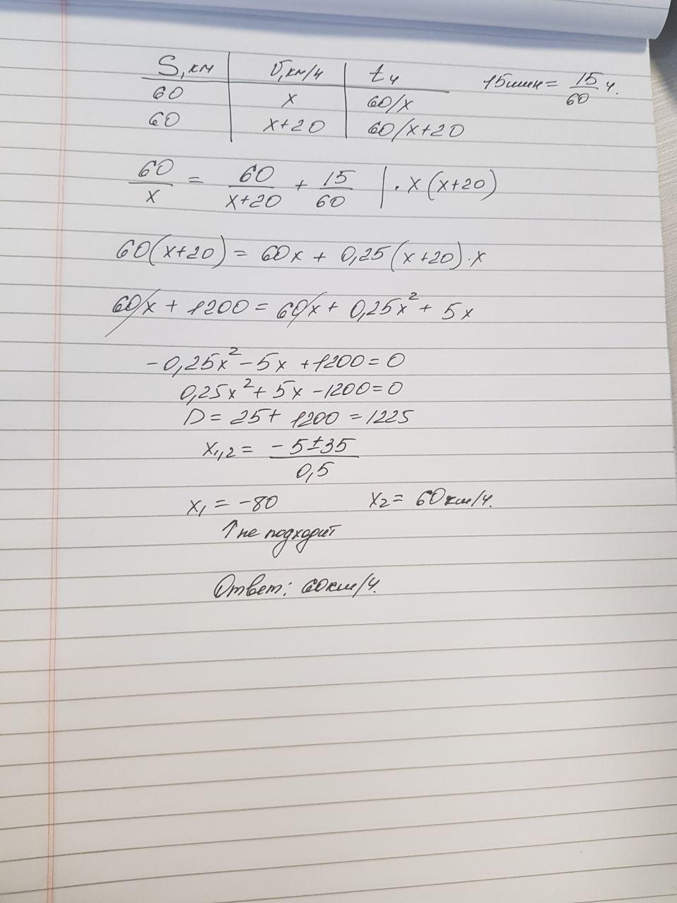 Автоьусс экспресс отправился от городского вокзала в аэропорт, который находится от него на расстоянии 60 км. Через 15 минут после отправления автобуса опоздавший на него пассажир поехал в аэропорт на такси. Скорость такси на 20 км/ч больше скорости автобуса.