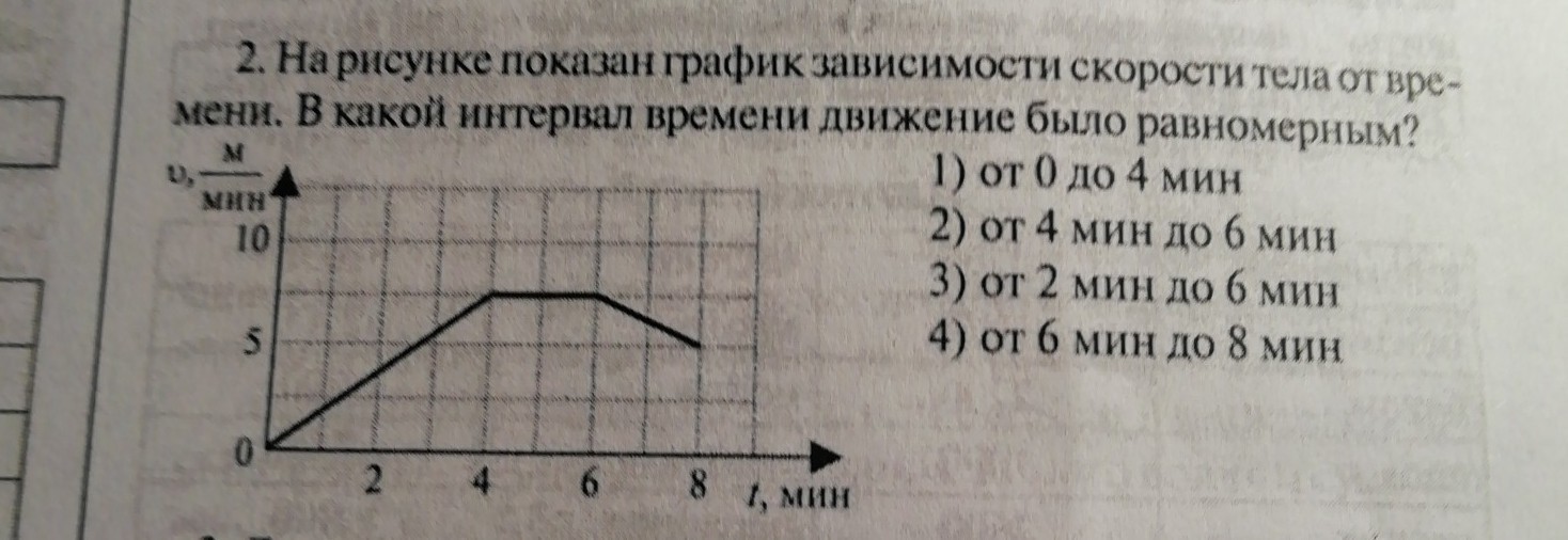 На рисунке показан график зависимости скорости тела от времени в Какой интервал времени движение было равномерным