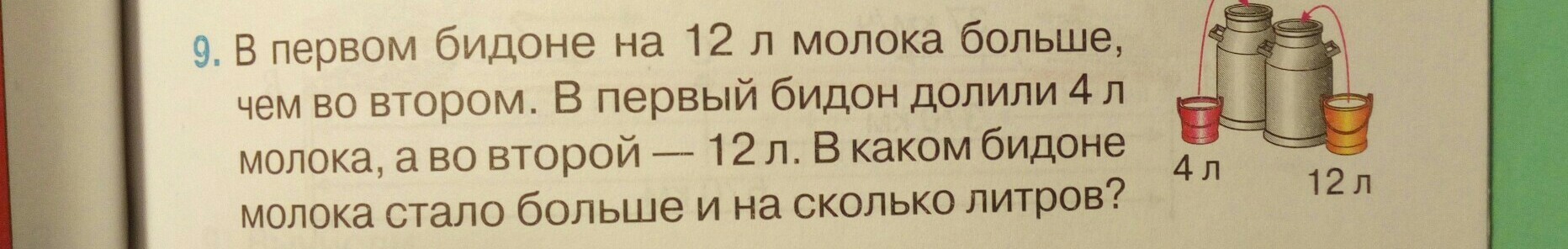 Пусть в первом бидоне будет 12+х литров молока (т.к там на 12 литров больше, берем исходное число литров за х), тогда во втором просто х. После переливания молока в первом бидоне стало 12+х+4= 16+х литров, а во втором х+12. Тогда мы можем найти разницу: 16-12=4 л.