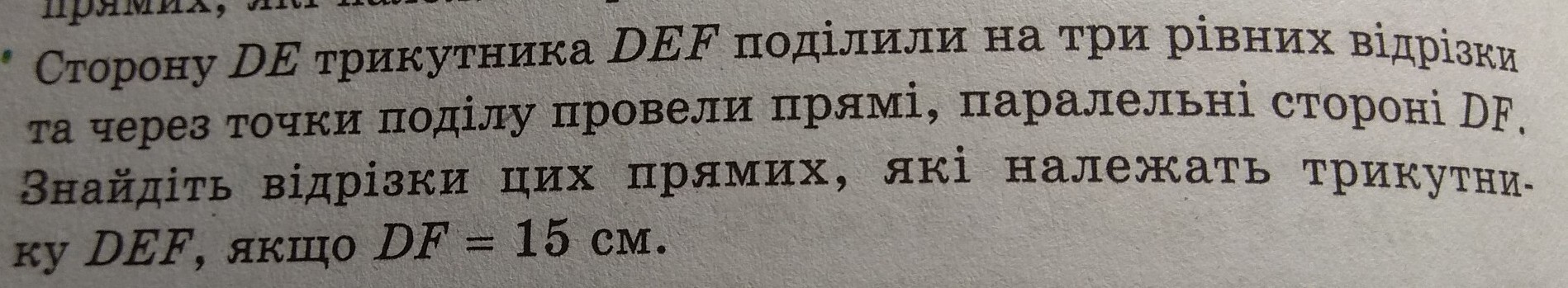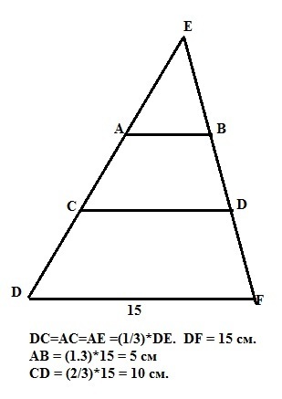 аналогично для второго отрезка DE/D₂E=DF/D₂F₂, DE/D₂E=3 ⇒ D₂F₂=1/3*DF=1/3*15=5 см