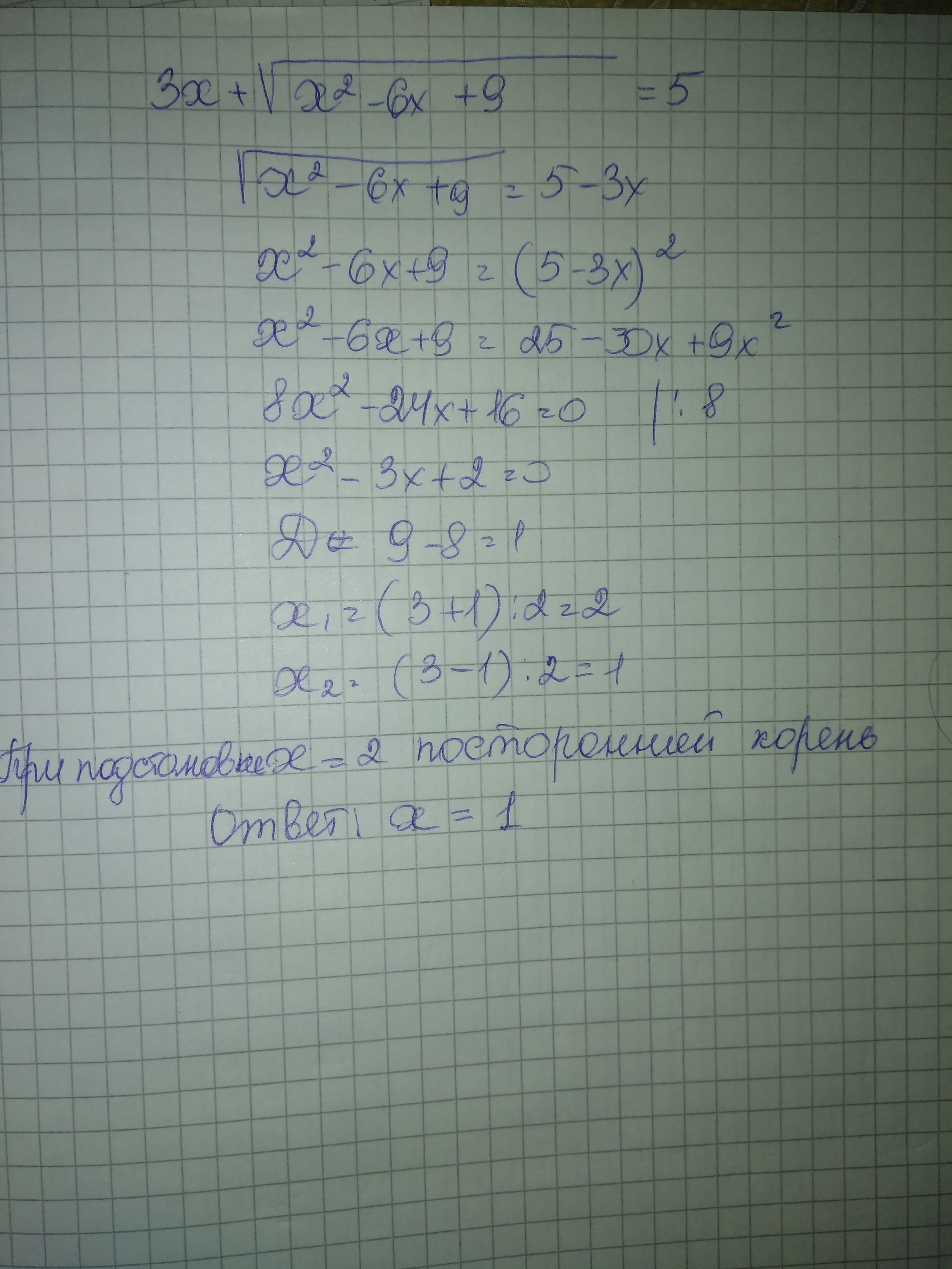 Проверка, подстановкой в исходное уравнение показывает, что х=1 является корнем, а х=2 не является корнем.