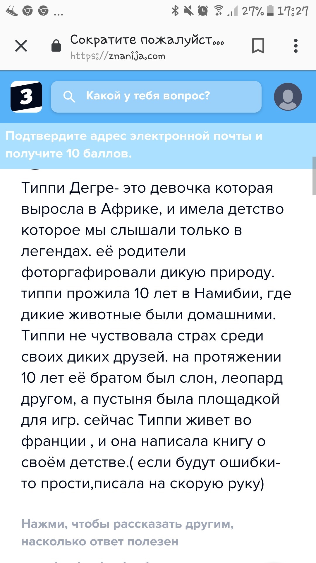 Tippi Degre is a girl who grew up in the Africa and has a childhood, which we heard in legends. Her parens photographed wild nature. Tippi lived 10 years in the Nambia, where wild animals were domestic. Tippi did not feel fear among her friends. For 10 years the elephant was her brother, the leopard was a friend and the desert was a playground. Nowadays Tippi lives in France, and he wrote a book about her childhood.