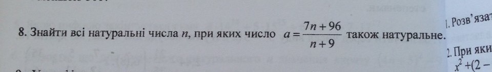 (7n + 96)/(n+9) = (7n + 63 + 33)/(n + 9) = 7(n+9)/(n+9) + 33/(n+9) = 7 + 33/(n+9)
