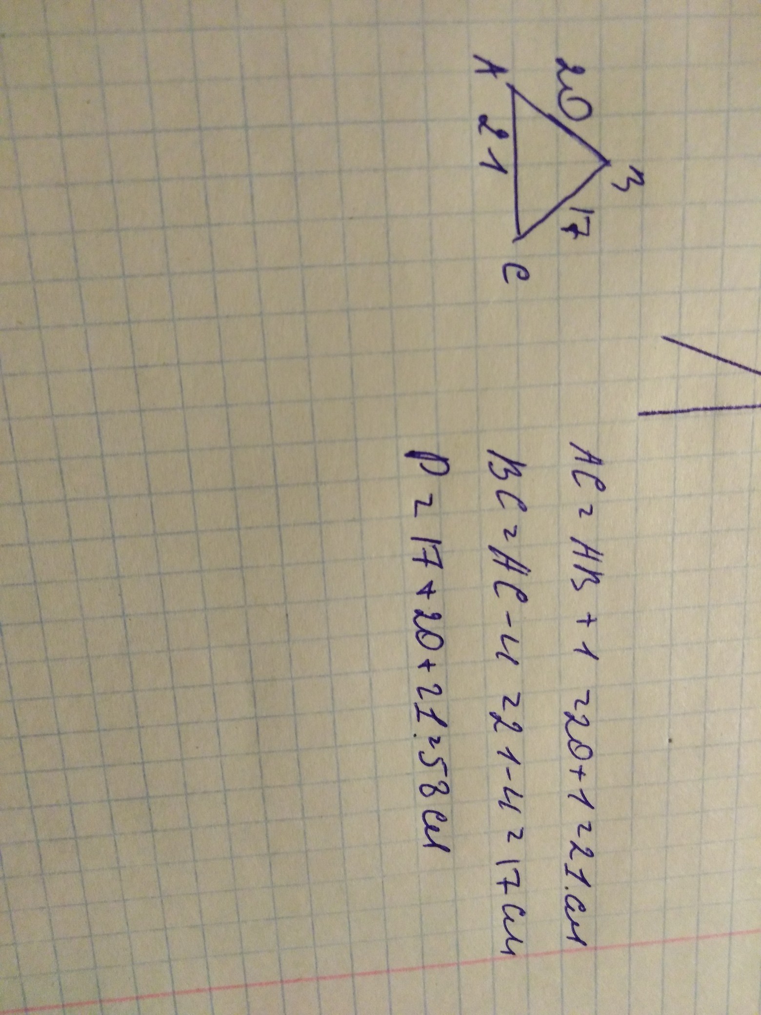 Сторона AB треугольника ABC равна 20 см, сторона AC на 1 см больше стороны AB,