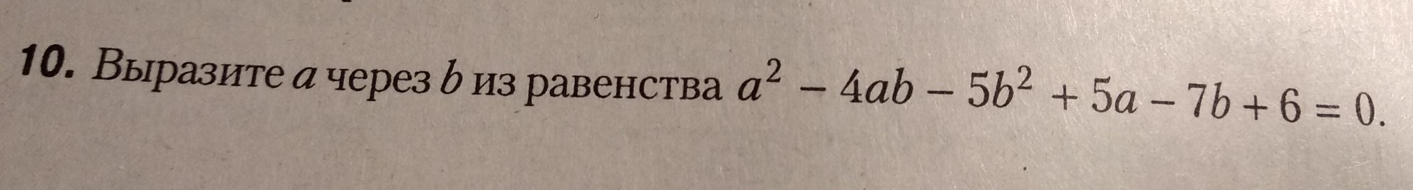 а^2+a(5-4b)-(5b^2+7b-6)=0 находим дискриминант Д=25-40в+в^2+20b^2+28b-24=21b^2-12b+1, тогда а1 , а2=(5-4в+ -V21b^2-12b+1)/2, VД-это корень из дискриминанта
