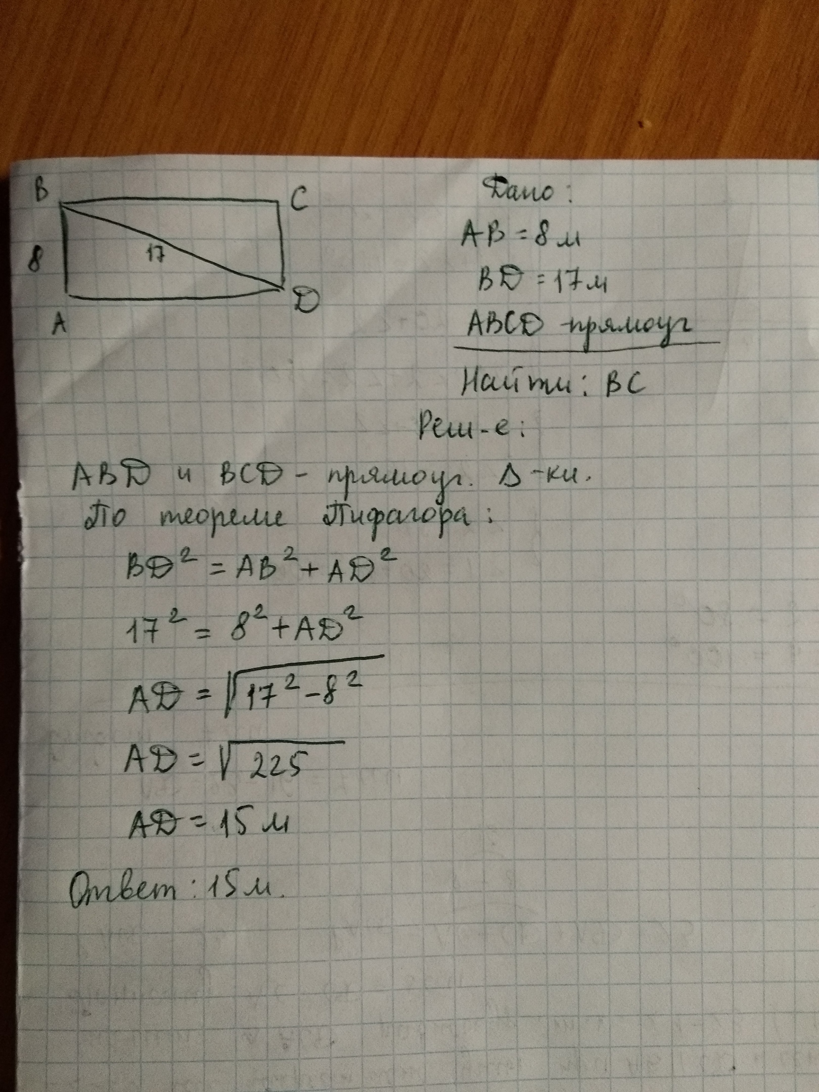Найдите одну из сторон прямоугольника если другая сторона и диагональ равны соответственно 8 м и 17 м