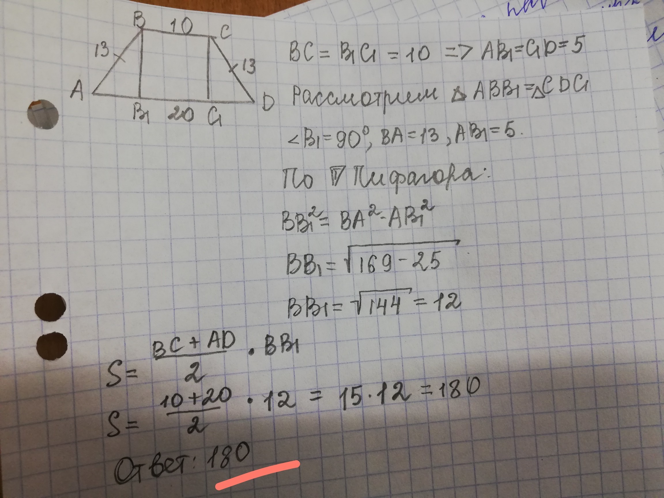 основания равнобедренной трапеции равны 10 и 20 а ее боковые стороны 13.найдите площадь трапеции