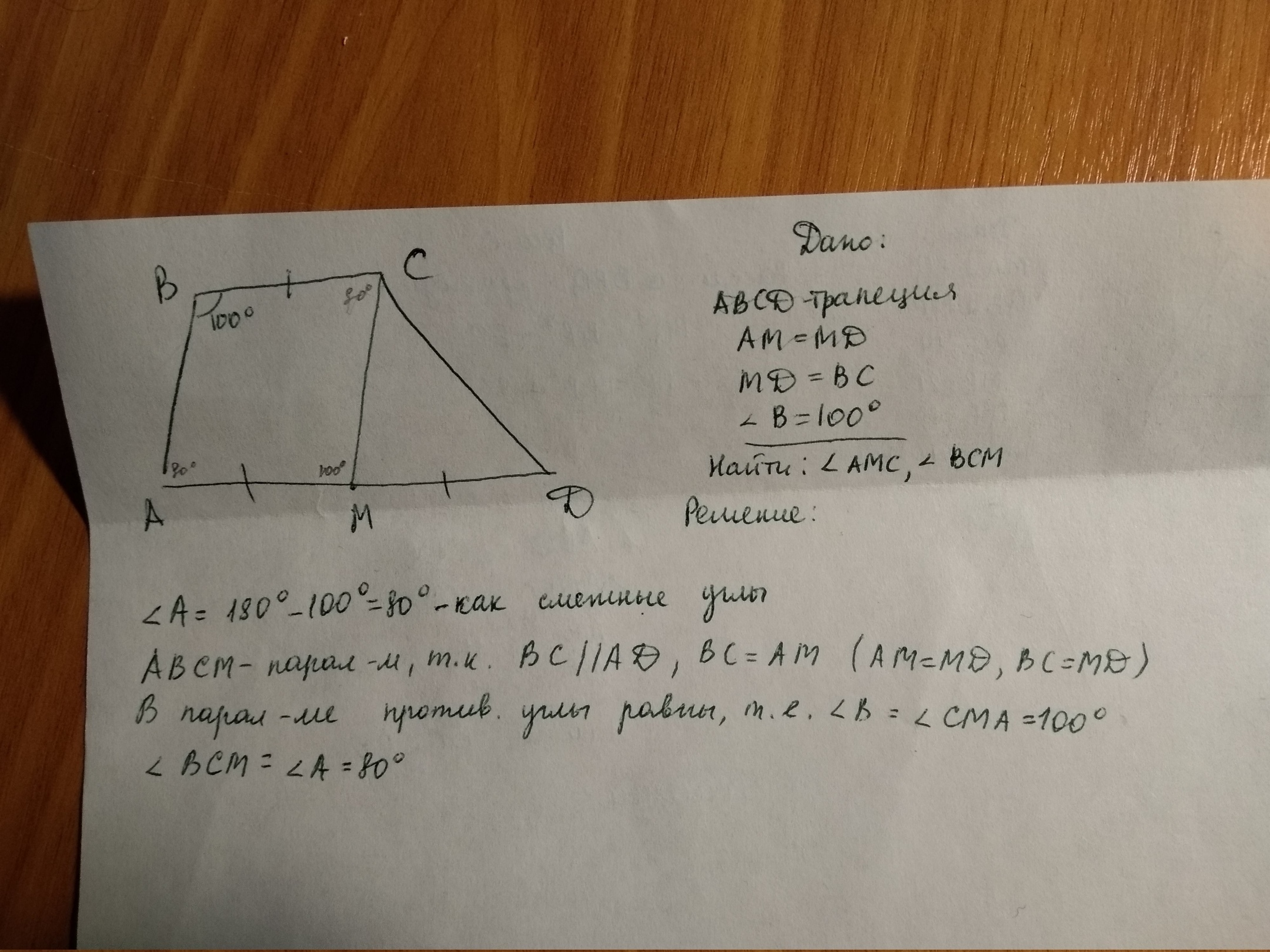 В трапеции ABCD Точка M- середина большего основания AD МD = BC угол B =100° градусов. Найдите углы AMC и BCM.