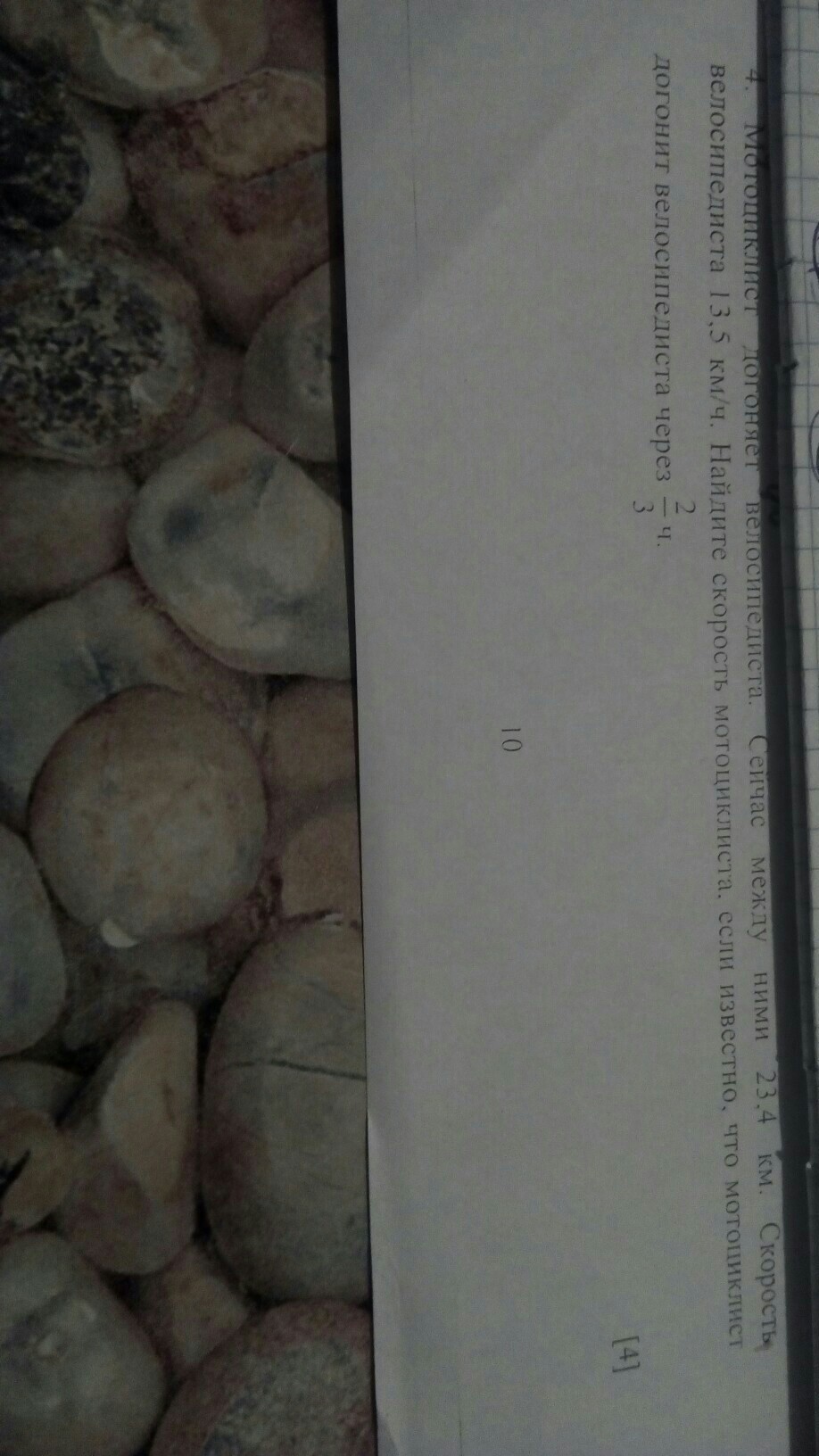 мотоциклист одного велосипедиста сейчас между ними 23.4 км скорость велосипедиста 13 целых 5 км ч Найдите скорость мотоциклиста если известно что мотоциклист догонит велосипедиста через 2/3 часов