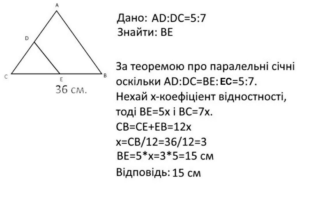 Есть ошибки: AD:DC=BE:EC; BE=5x; EC=7x; BC=12x. Дальше верно. Принимать решение нельзя.