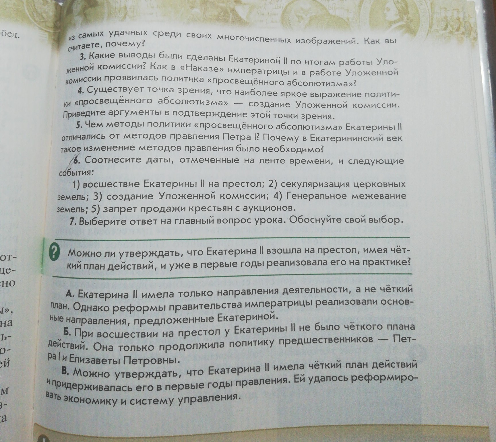 3. Во-первых, верховная власть лучше узнала нужды и степень развития российского общества. Во-вторых, под влиянием идей французских просветителей Комиссия впервые подняла насущные вопросы российской жизни. В-третьих, созыв Уложенной комиссии укреплял власть императрицы. В-четвёртых, Комиссия, не являясь ни парламентом, ни иным законодательным собранием, стала первым опытом создания верховной властью представительного учреждения в истории России. «Наказ» отстаивал единственно возможную, по её мнению, для России форму правления — абсолютную монархию. Именно монарх создаёт систему законов, которая способствует установлению «общего благоденствия» подданных. Такое утверждение вело к централизации управления страной, что являлось отступлением от идей просветителей, но учитывало традиции России. Автор «Наказа» требовал обязательного исполнения законов от всех, при этом был против пыток, требовал не устрашения людей, а воспитания законопослушных граждан.